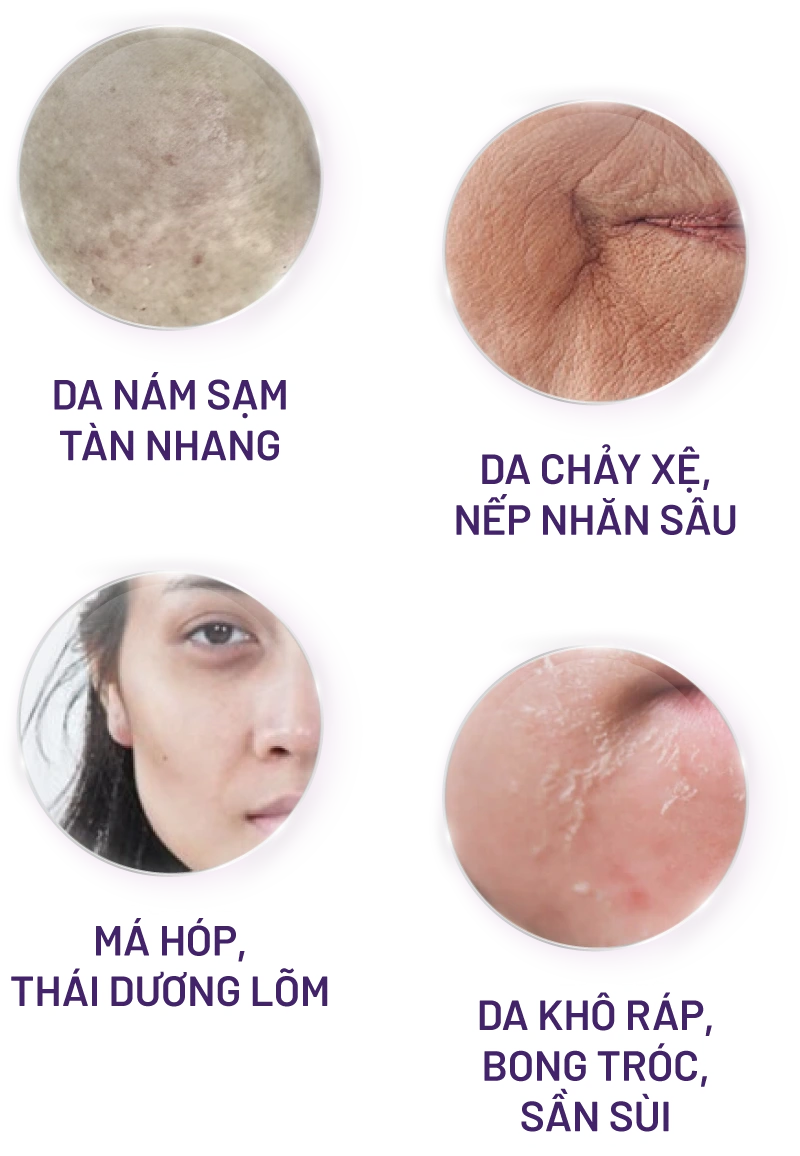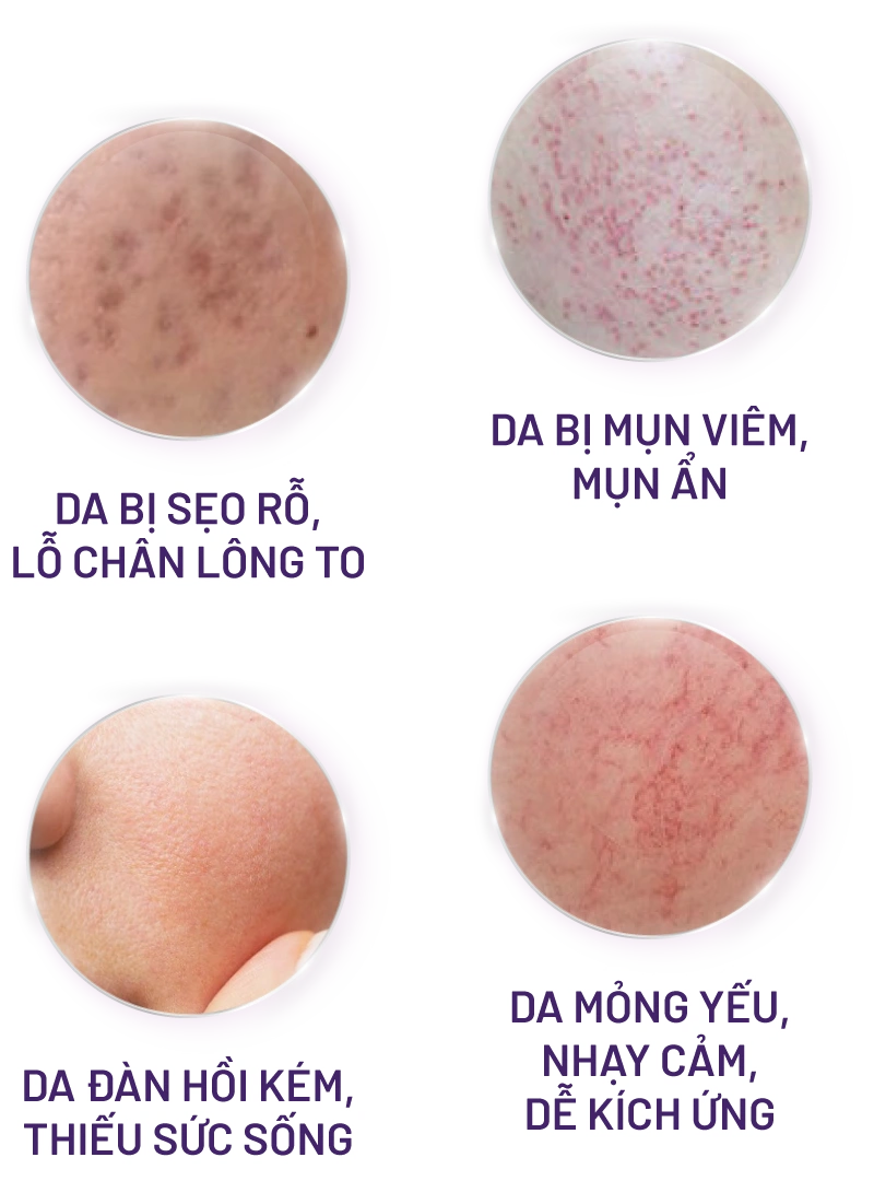 Kích thích sản sinh tế bào, lấp đầy sẹo rỗ, mờ nám sạm, phục hồi nền da mỏng yếu, kích ứng mỹ phẩm